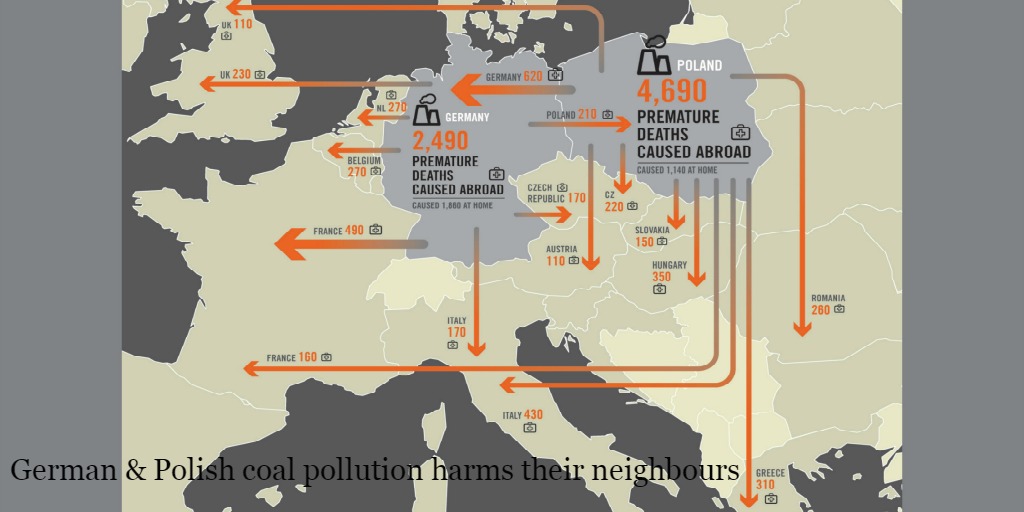 I cinque paesi dell'UE che più di tutti soffrono gli effetti dell'inquinamento prodotto dalle centrali a carbone nei paesi limitrofi, in aggiunta a quelli dei propri impianti, sono la Germania (3.630 morti premature in tutto), l' Italia (1.610), la Francia (1.380), la Grecia (1.050) e l'Ungheria (700).